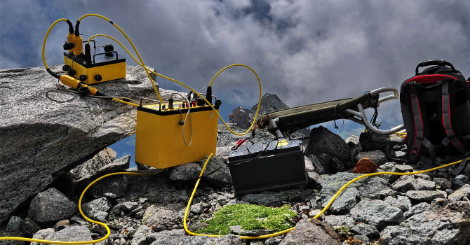 Die Geoelektrik ist ein geophysikalisches Verfahren zur zerstörungsfreien Erkundung des Untergrunds durch die Messung von elektrischer Spannung und Stromstärke an der Erdoberfläche. Geo5 setzt für diese Untersuchungen vorzugsweise eine sogenannte Multielektrodenapparatur ein. Bei geoelektrischen 2D-Messungen mit einer Multielektrodenapparatur werden entlang eines Profils an der Geländeoberfläche Stahlspieße (Elektroden) in konstanten Abständen eingeschlagen. Über diese - mit einem Kabel verbundenen - Elektroden wird über ein Elektrodenpaar Strom in den Untergrund eingespeist. Über zwei weitere Elektroden wird die Potentialdifferenz des erzeugten elektrischen Feldes gemessen und daraus ein scheinbarer elektrischer Widerstand bestimmt. Das einspeisende Stromelektrodenpaar und das messende Potentialelektrodenpaar werden nun über eine Steuerelektronik in wechselnden Positionen entlang des Profils zusammengeschalten.
